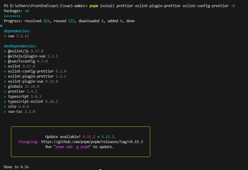 pnpm add prettier eslint-plugin-prettier eslint-config-prettier -Deslint-plugin-prettier 是一个 ESLint 插件,它允许 ESLint 使用 Prettier 的规则来检查代码风格。